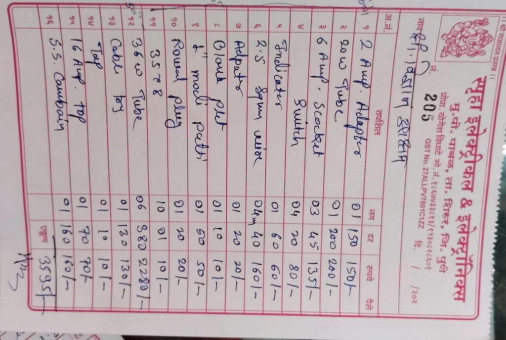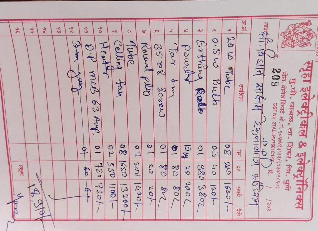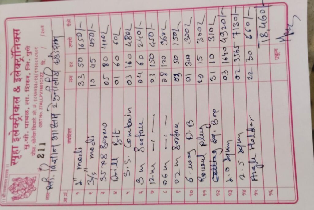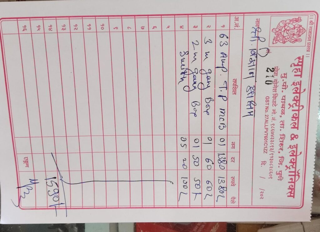 - गावामध्ये जाऊन वायर, स्विच, सॉकेट, MCB, बोर्ड, पट्टी इत्यादी मटेरियल खरेदी केली.