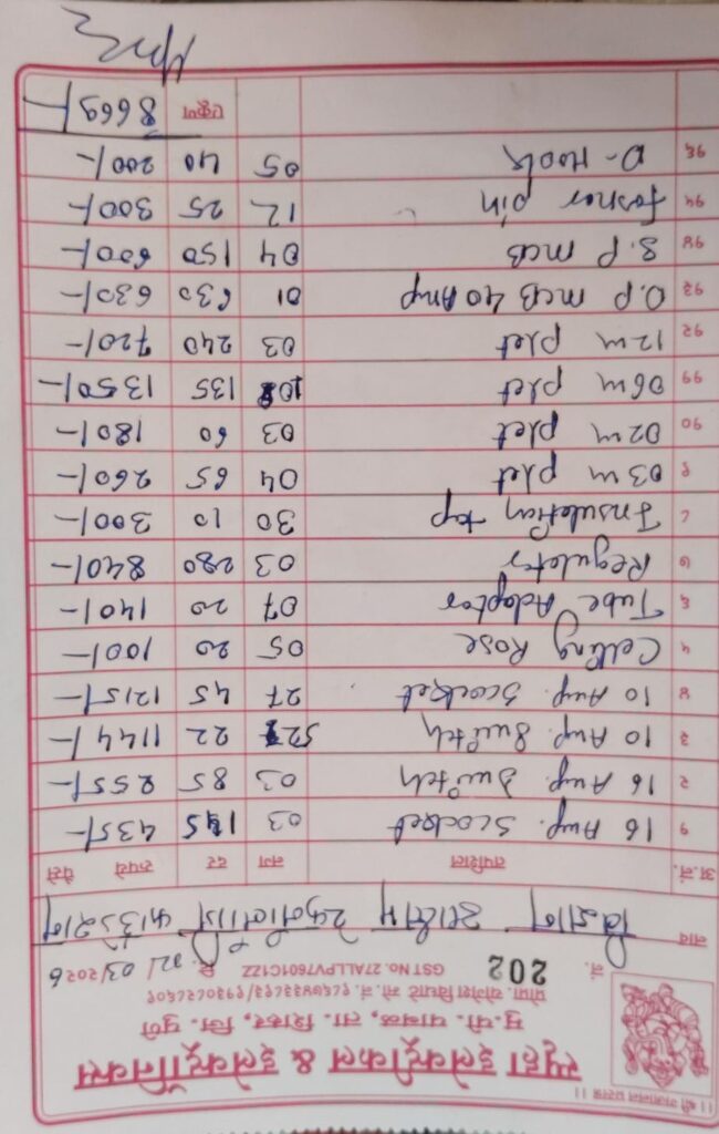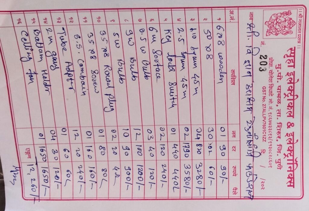 | अ.क्र | मालाचे नाव / साहित्य | नग / मीटर | दर (₹) | एकूण किंमत (₹) |
