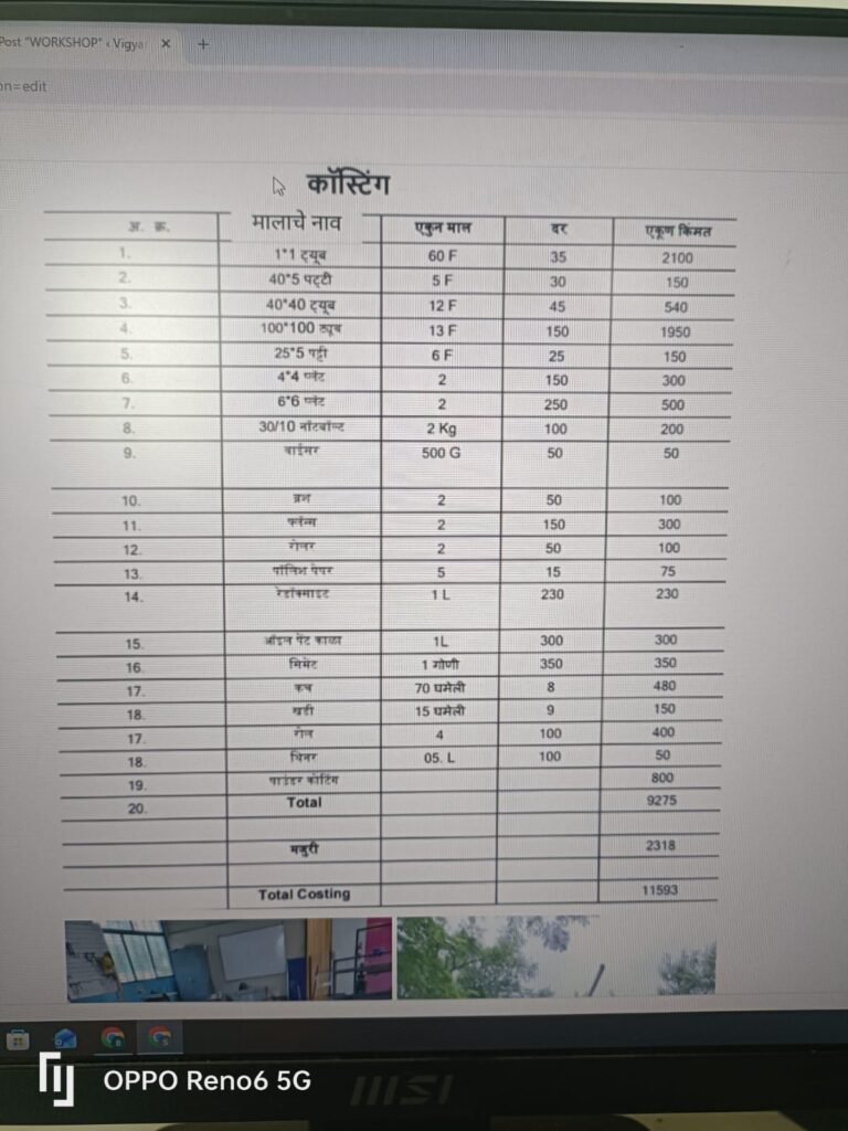 साहित्य:- २५ x २५ बॉक्स पाईप ५ नग , ४० x ४० १ नग ,१०० x १०० १ नग ,२५ x ५ १ नग , ४० x ५ पट्टी १ नग ,कलर १ लिटर , नट बोल्ट १० mm ३ किलो