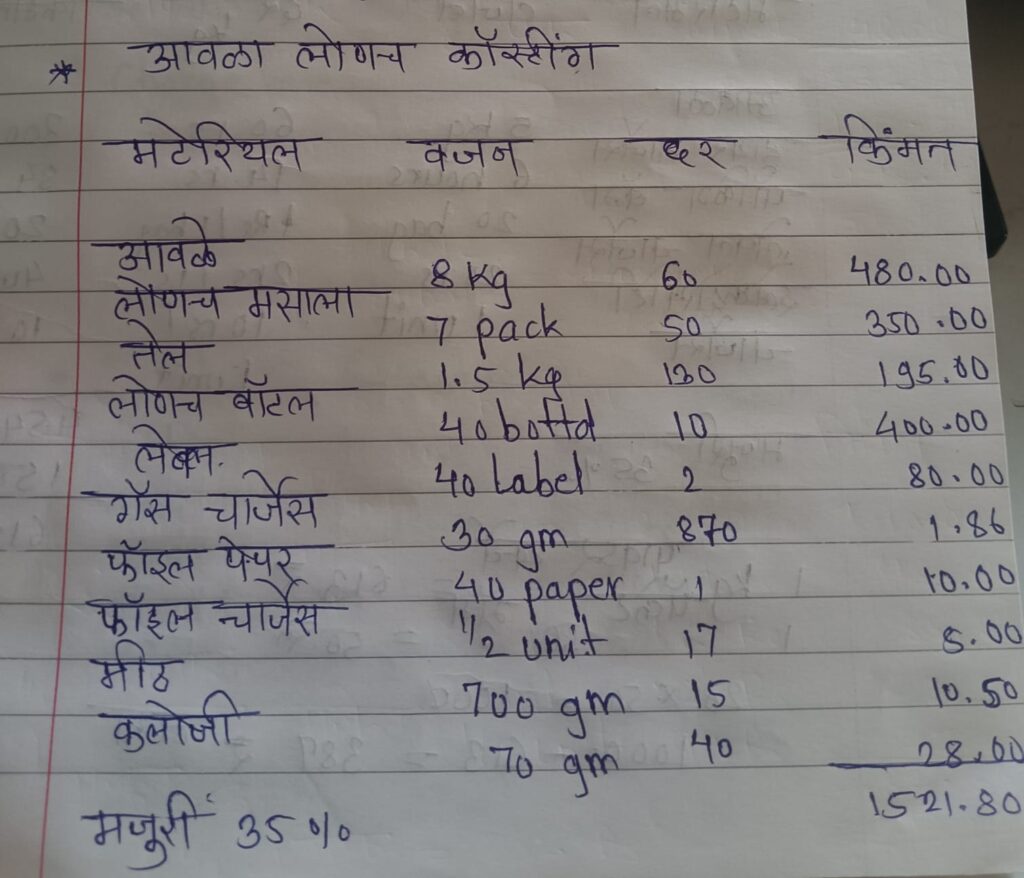 | मटेरियल | वजन | दर / kg | किंमत | |