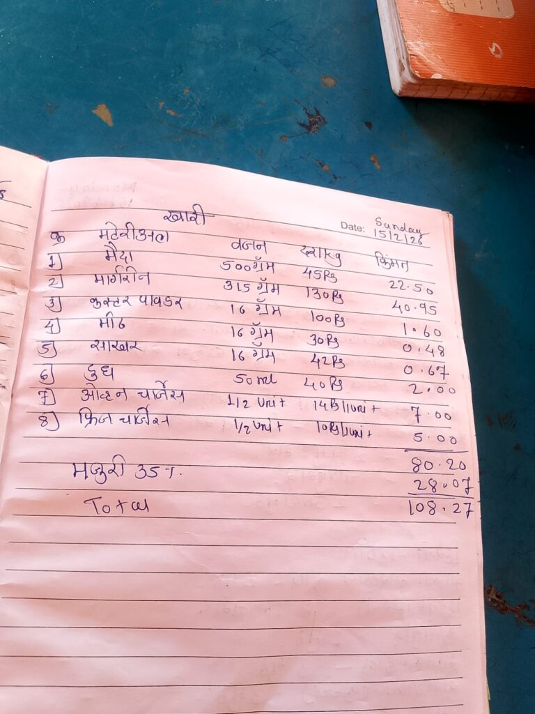 | अ.क्र. | साहित्य | वापरलेले वजन | दर / kg (₹) | खर्च (₹) |