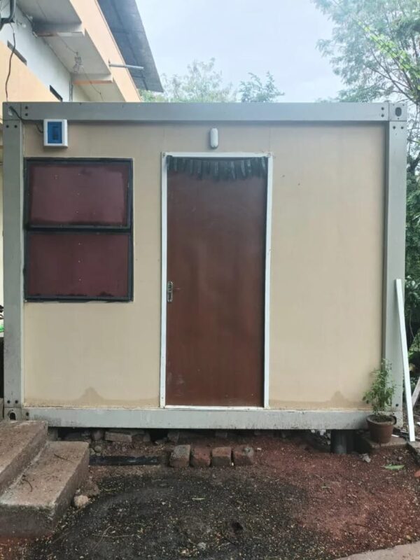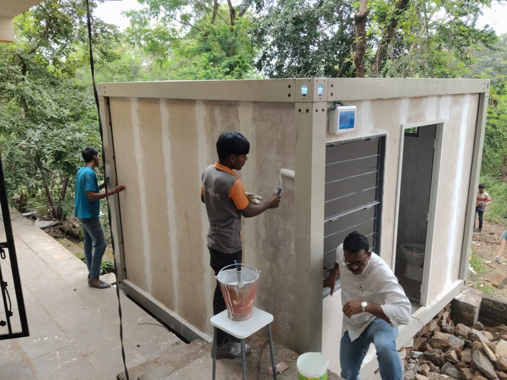 टेनी हाऊसमध्ये टॉयलेटसाठी स्क्वेअर बार वापरून फ्रेम तयार केली आणि त्यावर सिमेंट प्लाय बसवला.