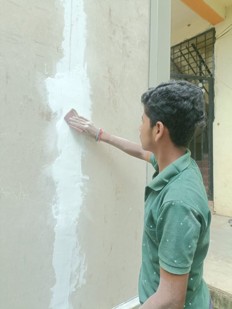 बाहेरून रंग केला, आत वारली चित्रकला केली, खांबाला काळा ऑइल पेंट लावला. बाहेर भिंत बांधली, झाडांच्या फांद्या कापल्या, पाणी जाण्यास भोक पाडले आणि पन्हाळीसाठी हिरवा प्लास्टिक पाईप लावला.