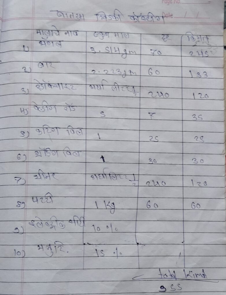| अ. क्र. | मालाचे नाव | एकूण माल | दर | एकूण किंमत |