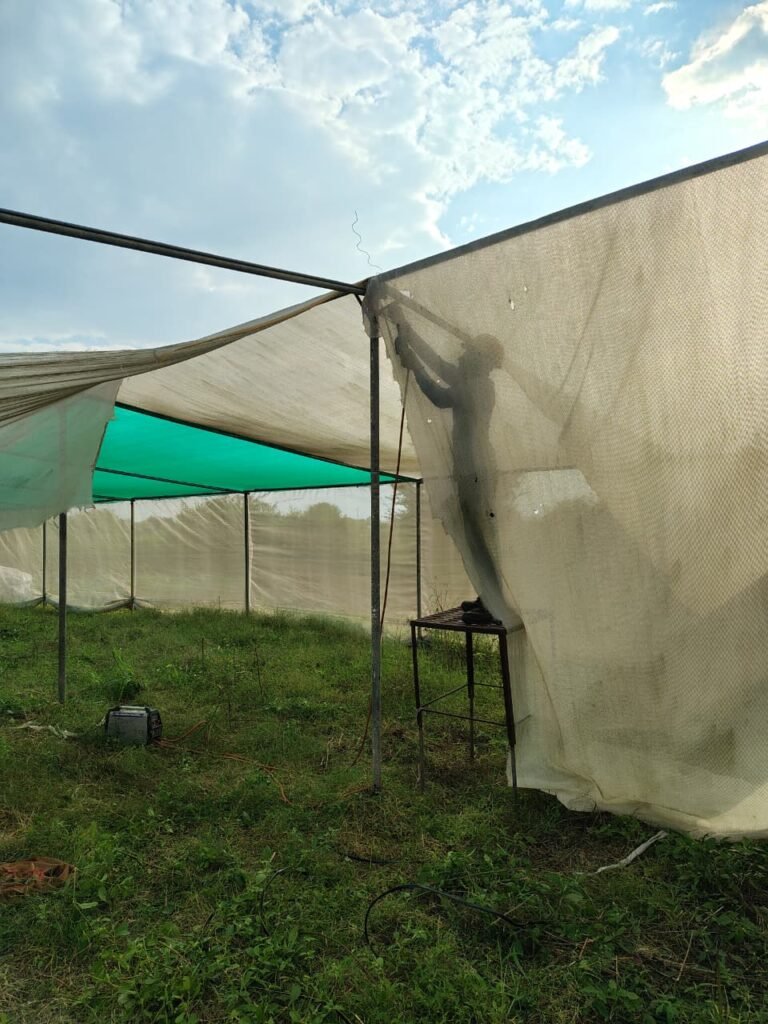 6×6 आकाराच्या शेडसाठी सर्वत्र 1 ते 1.5 फूट अँगल सपोर्ट लावले. सोळा फुटी पांढऱ्या कोटी पत्र्याचा वापर करून हिरवी शेडनेट बसवली. प्रोफाइल लावून सेल्फ स्क्रू व शेडनेट लावली. शेडला सपोर्ट देण्यासाठी GI अँगल जोडणी करून हुक, वेल्डिंग व खिळ्यांचा वापर केला.