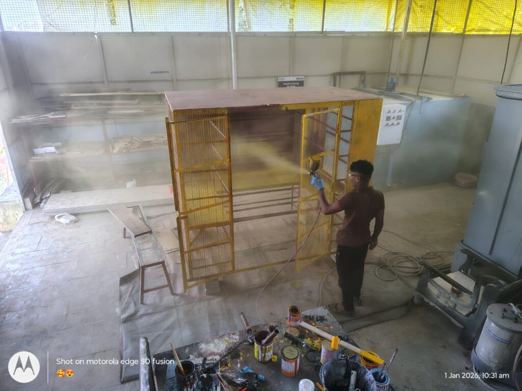 स्क्रॅपमधील लोखंडी रूम बाहेर काढून स्वच्छता व दुरुस्ती करण्यात आली. मशीन ठेवण्यासाठी योग्य माप घेऊन L अँगलच्या साहाय्याने मजबूत फ्रेम तयार केली. एका बाजूला 6 कप्पे व संपूर्ण रूममध्ये एकूण 18 कप्पे बनवून त्यामध्ये वेगवेगळ्या मशीन व पार्ट्स ठेवण्याची सोय केली. जाळी व पंचिंग शीट कटिंग करून स्क्रू व वेल्डिंगच्या सहाय्याने फिक्सिंग केली. कटिंग व ग्राइंडिंग करून कडा गुळगुळीत केल्या. शेवटी गंज रोखण्यासाठी रेड ऑक्साईड प्रायमर व त्यावर पिवळा ऑइल पेंट देण्यात आला.