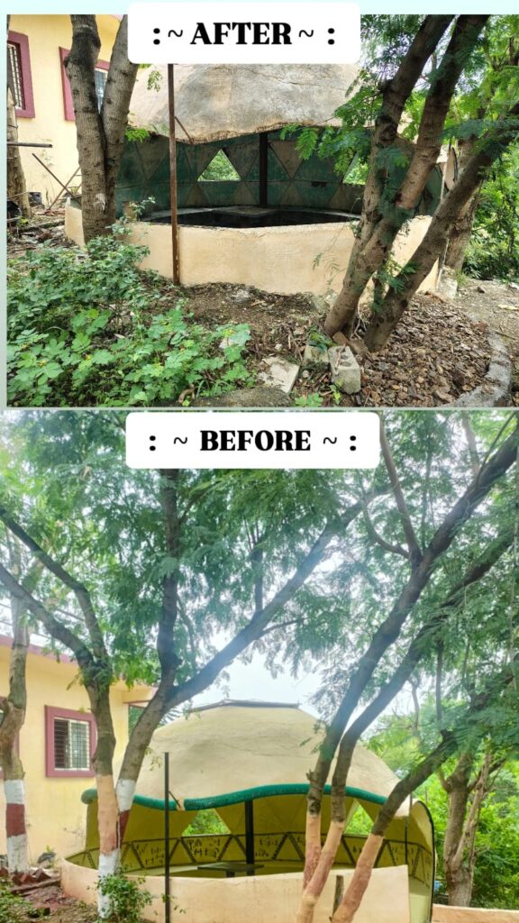 рд╕рд░реНрд╡рд╛рдд рдЕрдЧреЛрджрд░ рдбреЛрдордЪрд╛ рд╕рд░реНрд╡реЗ рдХреЗрд▓рд╛ . рдбреЛрдо рдордзреНрдпреЗ рдЖрдкрдг рд░реЗрдиреЛрд╡реЗрд╢рди рдХрд╕реЗ рдХрд░реВ рд╢рдХрддреЛ рдпрд╛рдЪреА рдЪрд░реНрдЪрд╛ рдХреЗрд▓реА рддреНрдпрд╛рдирдВрддрд░ рд╕реНрдХреЗрдЪрдк рд╡рд░ рдереНрд░реАрдбреА рдбрд┐рдЭрд╛рдИрди рддрдпрд╛рд░ рдХреЗрд▓реА .рдХрд╛рдорд╛рд▓рд╛ рд╕реБрд░реБрд╡рд╛рдд рдХреЗрд▓реА. рд╕рд░реНрд╡рд╛рдд рдЕрдЧреЛрджрд░ рдбреЛрдордЪреА рд╕реНрд╡рдЪреНрдЫрддрд╛ рдХреЗрд▓реА.рд╕реНрдХреНрд░реЕрдкрдЪреНрдпрд╛ рд╕рд╛рд╣реНрдпрд╛рдиреЗ рдЬреБрдирд╛ рдХрд▓рд░ рдХрд╛рдврд▓рд╛. рд╡ рдбреЛрдордЪреНрдпрд╛ рдЪрд┐рд░рд╛ рдордзреНрдпреЗ рдкреБрдЯреНрдЯреА рднрд░рд▓реА . рдбреЛрдорд▓рд╛ рдЖрддреВрди рдкреНрд░рд╛рдпрдорд░ рд▓рд╛рд╡рд▓рд╛ рд╡ рдбреЛрдордЪреНрдпрд╛рд╡рд░рдЪреНрдпрд╛ рд╕рд╛рдИрдбрд▓рд╛ рд╕рд┐рдореЗрдВрдЯ( рдирд╛рд░рдВрдЧреА ) рдХрд▓рд░ рд▓рд╛рд╡рд▓рд╛ .рдбреЛрдордЪреНрдпрд╛ рдмрд╛рд╣реЗрд░ рдмрд╕рдгреНрдпрд╛рд╕рд╛рдареА рдПрдХ рдЫреЛрдЯреАрд╢реА рднрд┐рдВрдд рдмрд╛рдВрдзрд▓реА рд╡ рддреНрдпрд╛рд▓рд╛ рдкреНрд▓реЕрд╕реНрдЯрд░ рдХрд░реВрди рдШреЗрддрд▓реЗ. рддреНрдпрд╛рд▓рд╛ рдкрдг рд╕рд┐рдореЗрдВрдЯ ( рдирд╛рд░рдВрдЧреА ) рдХрд▓рд░ рд▓рд╛рд╡рд▓рд╛ . рдбреЛрдордЪреНрдпрд╛ рдЖрддреАрд▓ рдмрд╛рдЬреВрд▓рд╛ рд▓реЗрдорди рдпреЗрд▓реЛ рд╣рд╛ рдлреНрд░реЗрд╢ рдХрд▓рд░ рд▓рд╛рд╡рд▓рд╛. рдбреЛрдордЪреНрдпрд╛ рдЖрддреАрд▓ рдЫрддреНрд░реАрд╕рд╛рд░рдЦреЗ рд╕реНрдЯреНрд░рдХреНрдЪрд░рд▓рд╛ рдмреНрд▓реЕрдХрдСрдИрд▓ рдкреЗрдВрдЯ рд▓рд╛рд╡рд▓рд╛. рддреБрдордЪреНрдпрд╛ рдЖрддреАрд▓ рд╡рд╛рдЬреВрди рд╡рд╛рд░рд▓реА рдЪрд┐рддреНрд░рд╛рджреНрд╡рд╛рд░реЗ рдЖрд╢реНрд░рдорд╛рддреАрд▓ рд╡рд┐рджреНрдпрд╛рд░реНрдереНрдпрд╛рдВрдЪреА рджрд┐рдирдЪрд░реНрдпрд╛ рджрд╛рдЦрд╡рдгреНрдпрд╛рдЪрд╛ рдкреНрд░рдпрддреНрди рдХреЗрд▓рд╛.рдбреЛрдордЪреНрдпрд╛ рд╢реЗрдЬрд╛рд░реАрд▓ рдкрд░рд┐рд╕рд░рд╛рдд рдЪреА рд╕рд╛рдлрд╕рдлрд╛рдИ рдХреЗрд▓реА. рдЭрд╛рдбрд╛рдЪреА рдХрдЯрд┐рдВрдЧ рдХреЗрд▓реЗ.