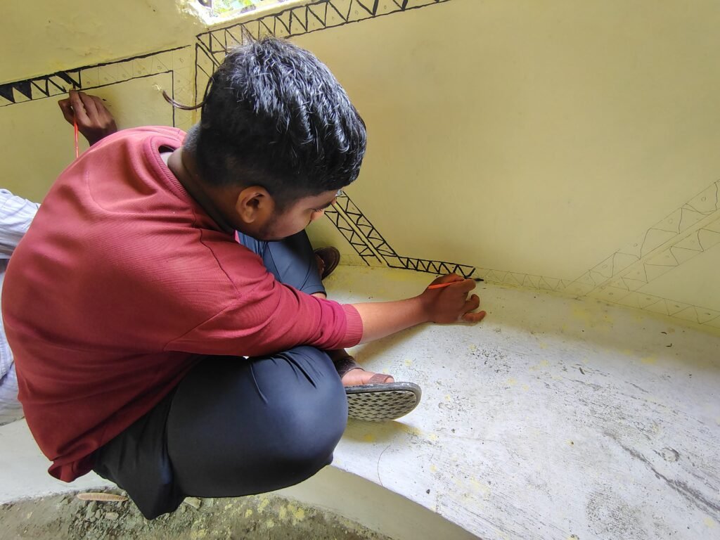 बाहेरून रंग केला, आत वारली चित्रकला केली, खांबाला काळा ऑइल पेंट लावला. बाहेर भिंत बांधली, झाडांच्या फांद्या कापल्या, पाणी जाण्यास भोक पाडले आणि पन्हाळीसाठी हिरवा प्लास्टिक पाईप लावला.
