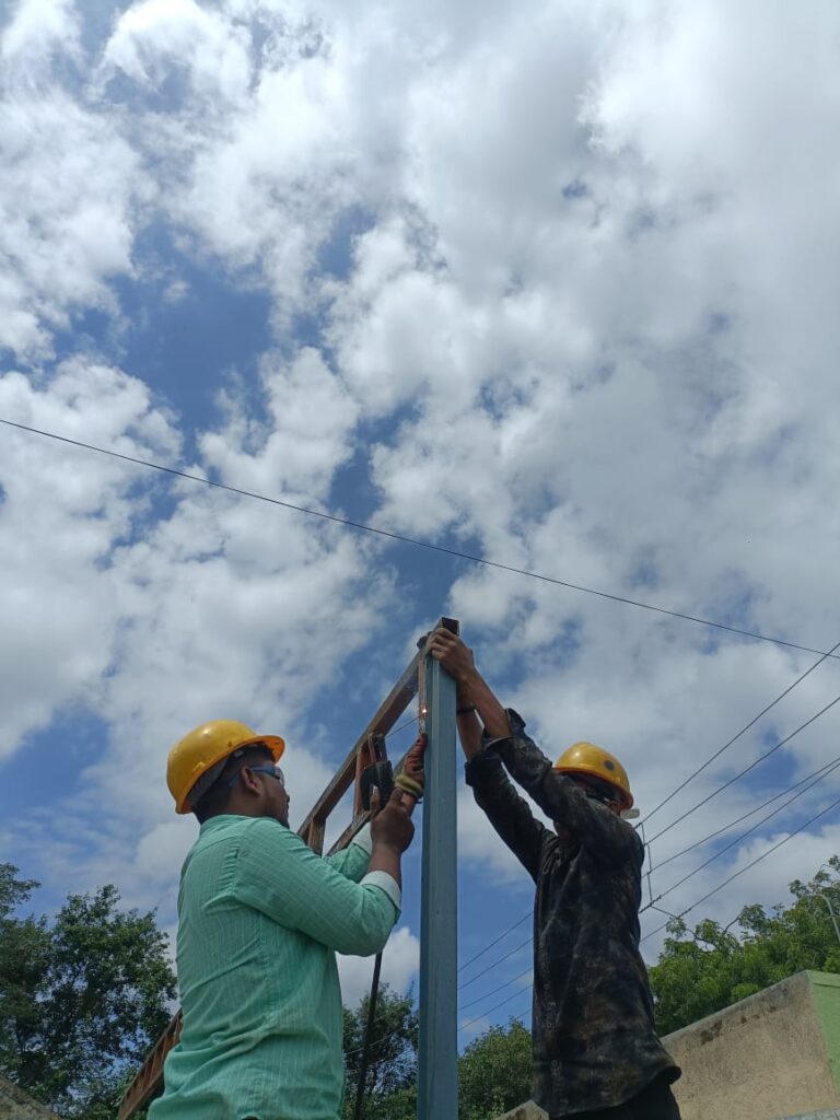 . рд╕рд░реНрд╡ рдЦрд┐рдбрдХреНрдпрд╛рдВрдЪреЗ рдЕрдЪреВрдХ рдореЛрдЬрдорд╛рдк рдШреЗрддрд▓реЗ. рддреАрди рд╡реЗрдЧрд╡реЗрдЧрд│реНрдпрд╛ рдорд╛рдкрд╛рдВрдЪреНрдпрд╛ рдЧреНрд░реАрд▓рдЪреА рдХреЙрд╕реНрдЯрд┐рдВрдЧ рдХреЗрд▓реА рд╡ рд╕рд╛рд╣рд┐рддреНрдп рдЦрд░реЗрджреА рдХреЗрд▓реЗ.30├Ч3 L-angleрд╡рд╛рдкрд░реВрди рд╕рд░реНрд╡ рдЧреНрд░реАрд▓рдЪреА рдлреНрд░реЗрдо рддрдпрд╛рд░ рдХреЗрд▓реА. рек├Чрен рдЧреНрд░реАрд▓рд╕рд╛рдареА рдлреНрд░реЗрдордордзреНрдпреЗ 2├Ч2 рдЬрд╛рд│реА рдмрд╕рд╡рд▓реА. рддреНрдпрд╛рд╡рд░ 4 рдЗрдВрдЪ рдЕрдВрддрд░рд╛рд╡рд░ рдЖрдбрд╡реЗ 10├Ч10 рд╕реНрдХреНрд╡реЗрдЕрд░ рдмрд╛рд░ рд▓рд╛рд╡рд▓реЗ.рд╡ рдЪрд╛рд░ рдЙрднреЗ рд╕реНрдХреНрд╡реЗрдЕрд░ рдмрд╛рд░ рдмрд╕рд╡рд▓реЗ. рд╕рд░реНрд╡ рдмрд╛рд░ рд╡ рдЕрдБрдЧрд▓рдЪреА рд╡реЗрд▓реНрдбрд┐рдВрдЧ рдХрд░реВрди рдордЬрдмреБрддреА рджрд┐рд▓реА.рд╡реЗрд▓реНрдбрд┐рдВрдЧрдирдВрддрд░ рд╕рдВрдкреВрд░реНрдг рдЧреНрд░реАрд▓рд▓рд╛ рдЧреНрд░рд╛рдЗрдВрдбрд┐рдВрдЧ рдХрд░реВрди рд╕реНрдореВрде рдлрд┐рдирд┐рд╢ рджрд┐рд▓реА. рднрд┐рдВрддреАрдд рдмрд╕рд╡рдгреНрдпрд╛рд╕рд╛рдареА 30├Ч3 рдЕрдБрдЧрд▓рдЪреЗ рдЪрд╛рд░ рддреБрдХрдбреЗ рдЬреЛрдбрд▓реЗ. рдЧреНрд░реАрд▓рд▓рд╛ рдкреНрд░рдердо Red Oxide рдкреНрд░рд╛рдЗрдорд░ рд▓рд╛рд╡рд▓рд╛. рддреНрдпрд╛рдирдВрддрд░ рдХрд╛рд│рд╛ рдСрдЗрд▓ рдкреЗрдВрдЯ рд▓рд╛рд╡реВрди рдлрд┐рдирд┐рд╢рд┐рдВрдЧ рджрд┐рд▓реЗ.